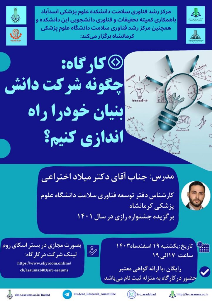 مرکز رشد فناوری سلامت دانشکده علوم پزشکی اسداباد با همکاری کمیته تحقیقات و فناوری دانشجویی این دانشکده و همچنین مرکز رشد فناوری سلامت دانشگاه علوم پزشکی کرمانشاه برگزار میکند: