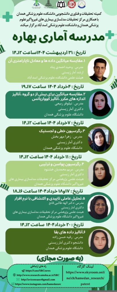 📣 کمیته تحقیقات و فناوری دانشجویی دانشگاه علوم پزشکی همدان با همکاری کمیته تحقیقات و فناوری دانشجویی دانشکده بهداشت و مرکز تحقیقات مدلسازی بیماری های غیر واگیر دانشگاه علوم پزشکی همدان و دانشکده علوم پزشکی اسداباد برگزار میکند: