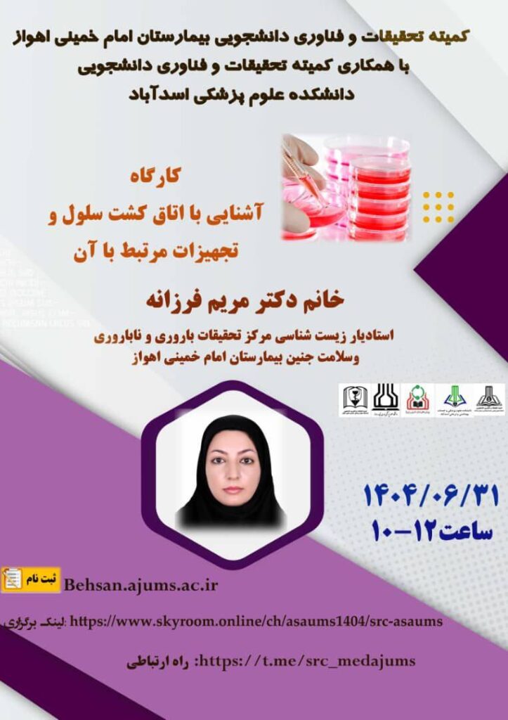 کمیته تحقیقات و فناوری دانشجویی بیمارستان امام خمینی (ره) اهواز با همکاری کمیته تحقیقات و فناوری دانشجویی دانشکده علوم پزشکی اسدآباد برگزار میکنند: